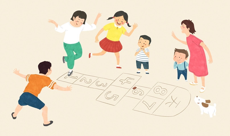 游戲玩法:按格子里的數(shù)字順序跳格子,珠子落在線上和線外就罰出場。