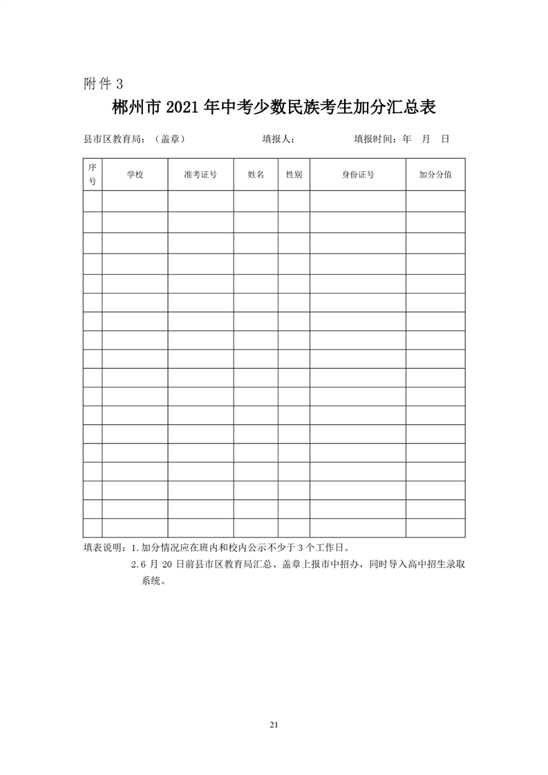 各縣市區(qū)教育局應(yīng)將少數(shù)民族考生加分情況,錄入“郴州市高中階段招生錄取系統(tǒng)”(以下簡稱“高中招生錄取系統(tǒng)”),并于6月20日前將《郴州市2021年中考少數(shù)民族考生加分匯總表》(附件3)報市中招辦