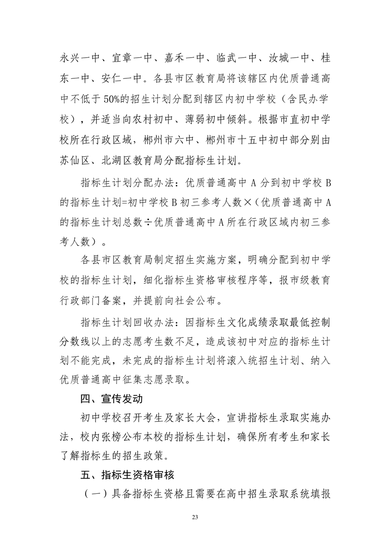 指標(biāo)生計劃在招生計劃中單列。各縣市區(qū)教育局將所轄公辦優(yōu)質(zhì)普通高中不少于50%的招生計劃(具體比例由各縣市區(qū)教育局確定)分配到區(qū)域內(nèi)的初中學(xué)校(含民辦學(xué)校),并適當(dāng)向農(nóng)村初中、薄弱初中傾斜分配指標(biāo)生計劃的優(yōu)質(zhì)普通高中為郴州市二中、郴州市三中、資興市立中學(xué)、桂陽三中、桂陽一中、永興一中、宜章一中、嘉禾一中、臨武一中、汝城一中、桂東一中、安仁一中等12所縣市區(qū)所轄優(yōu)質(zhì)普通高中。