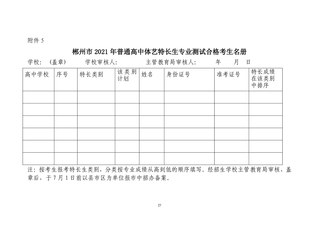 4.郴州市2021年指標(biāo)生實施辦法5.郴州市2021年普通高中體藝特長生專業(yè)測試合格考生名冊6.郴州市2021年普通高中體藝特長生特招生名冊